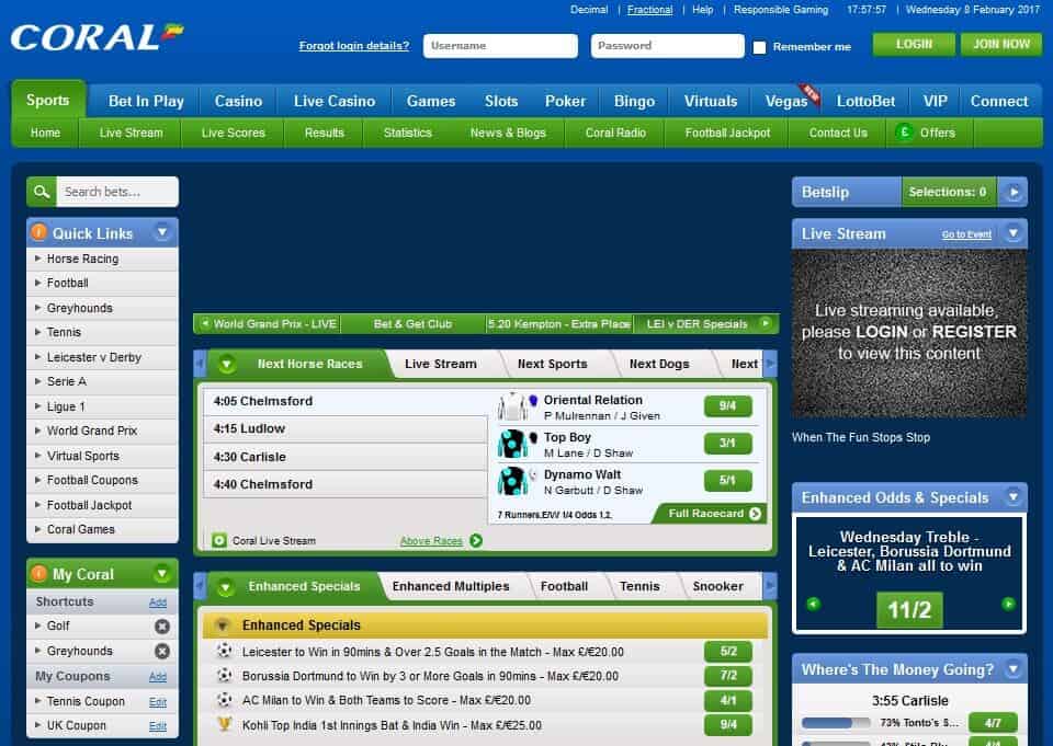 Coral offers its customers a quick and easy method to login to its website. If you are new to the site simply slick the “Join Now” button to register for an account. You will be taken to a two-step registration process that requires you to complete a few personal details before your account is opened. New customers can receive free bets after placing their first bet. Once you are registered, click the “Log In” button at the top right-hand corner of the website to be directed to the Coral login page. Enter your username and password and you will be taken to the betting homepage. Try not to make a mistake during the login process as you will be locked out of your account if you enter the wrong details too many times. If you forget either your username or password, just click the appropriate link and enter a few simple details to reset your account. You will receive an email containing a link – just click through to be taken to a secure web page that will give you the option to reset your details on the Coral login page. Once you have completed the process you will be able to access all your favourite betting markets with your new login details. If you are unable to successfully regain access to the Coral website, click the “Contact Us” button to send an email to their customer support team who will be happy to help.